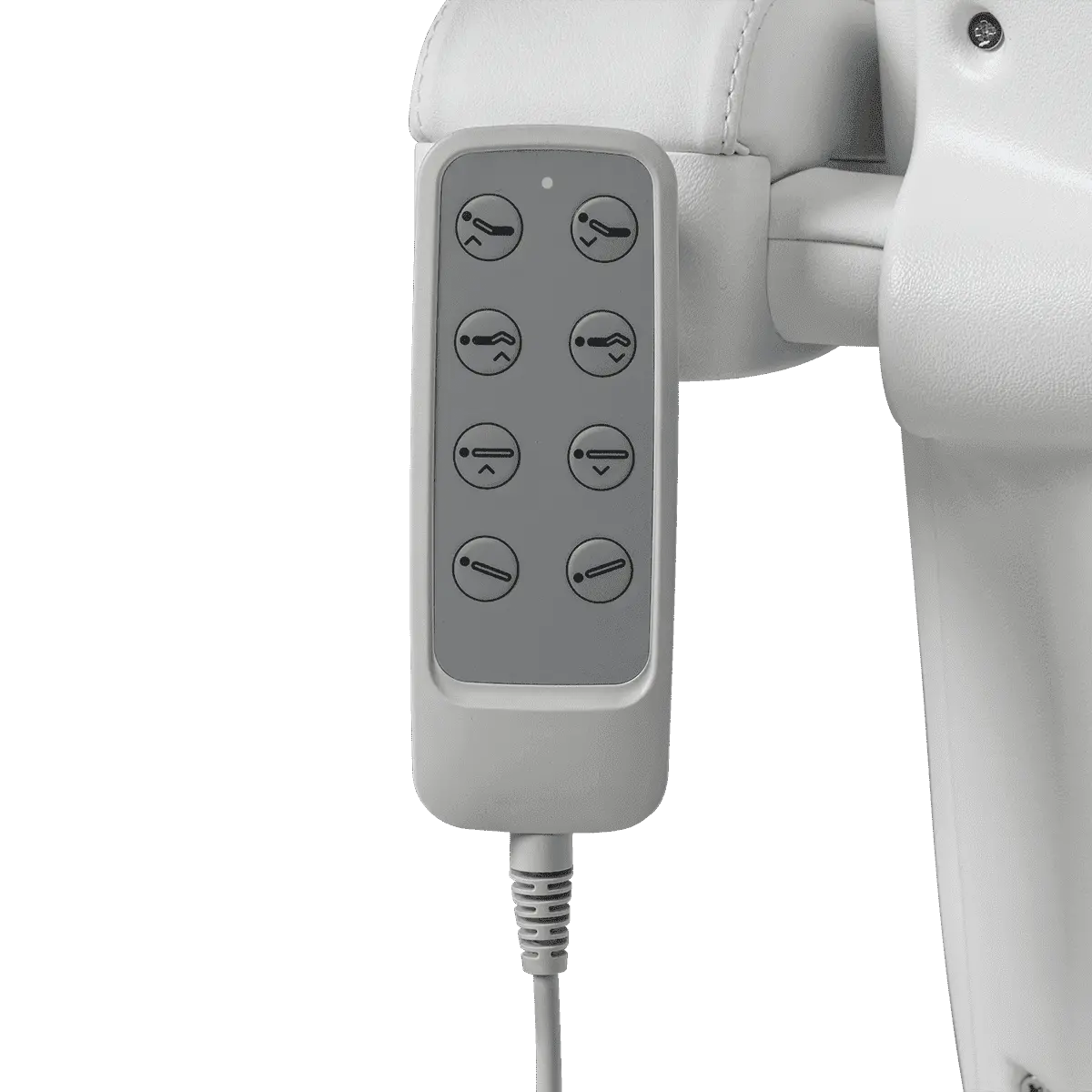 Комплектация: основание на подпятниках, каркас, мягкие элементы (сиденье, спинка и подушка под ноги, подголовник с отверстием для лица и подлокотники), электропривод 4 мотора, пульт управления.