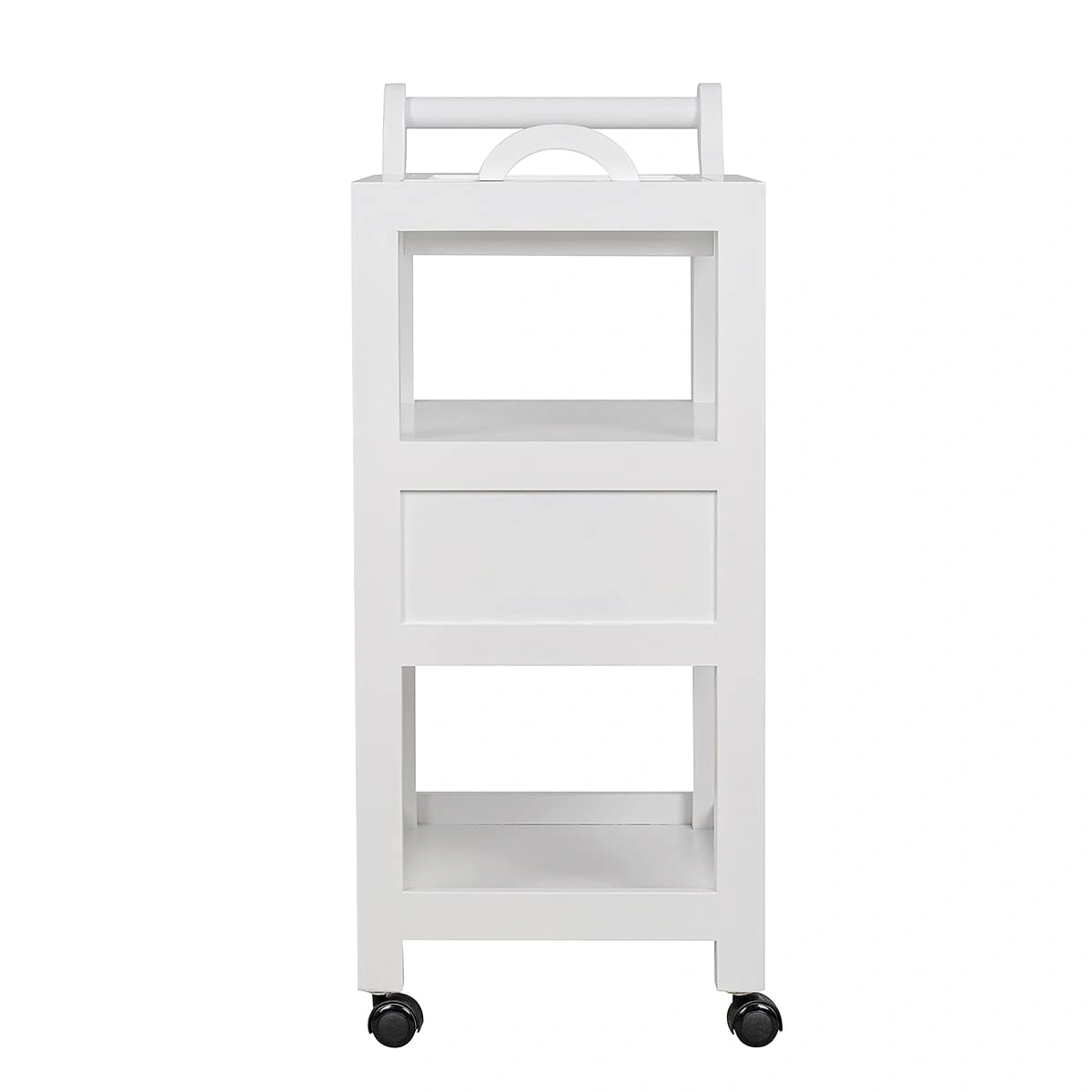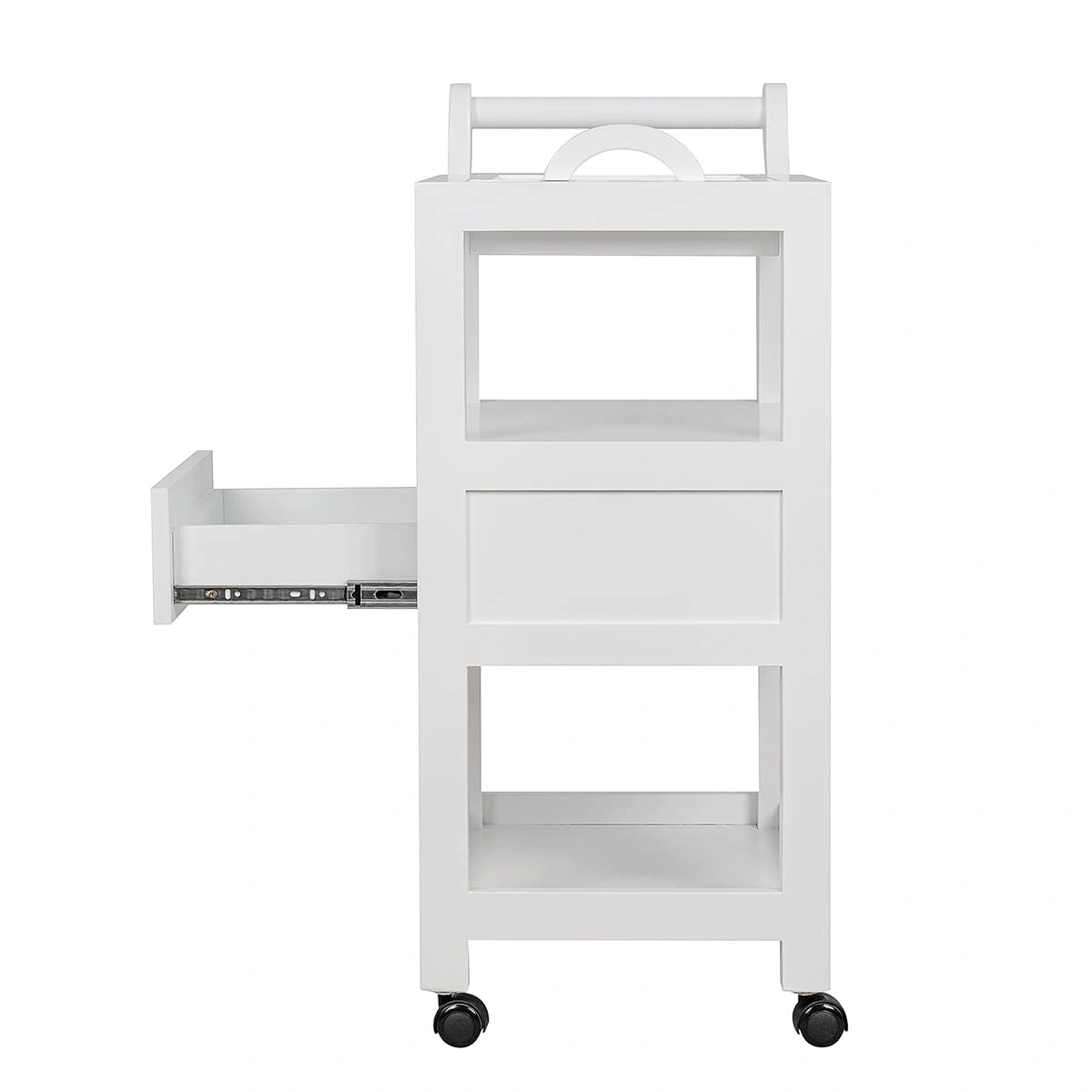Имея довольно компактные размеры, конструкция столика позволяет ему выполнять сразу множество функций. В закрытом выдвижном ящике можно хранить расходные материалы и мелкие аксессуары. Три открытые полки на разном уровне, верхняя и нижняя обрамлены бортиками со всех сторон, которые надежно защищают размещенные на них предметы от падения.