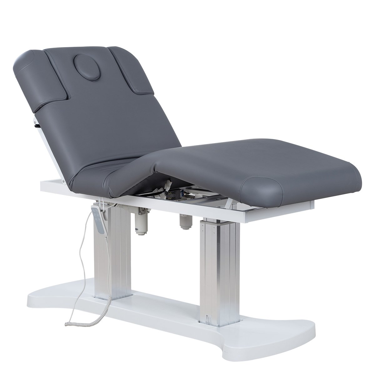 В спинке СПА-кушетки есть специальный вырез для лица, который при необходимости можно закрыть подушкой. Подлокотники регулируются по высоте и адаптируются под клиента — обеспечивая удобство в положении лёжа на животе. Благодаря единому ложу без разделения на секции, кушетка подходит абсолютно для всех процедур сразу в трёх направлениях: косметология, спа и массаж. Комплектуется ручным или ножным пультом — на выбор!