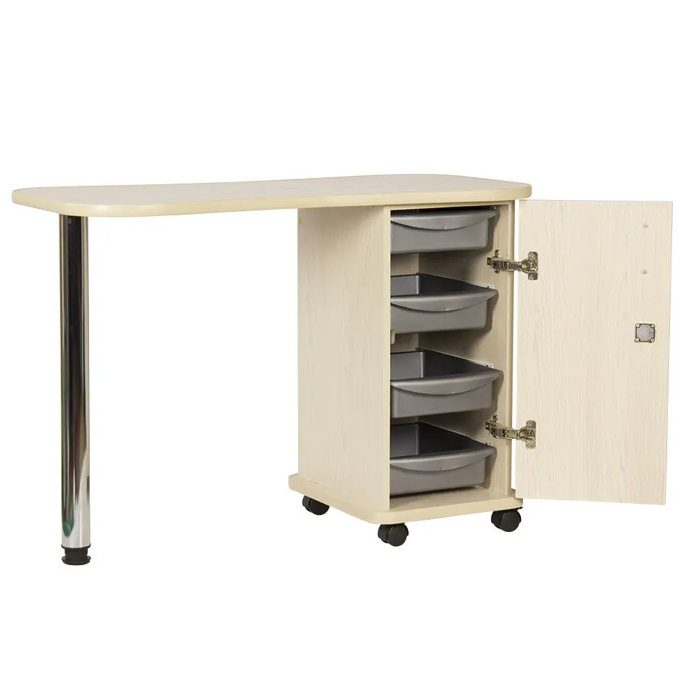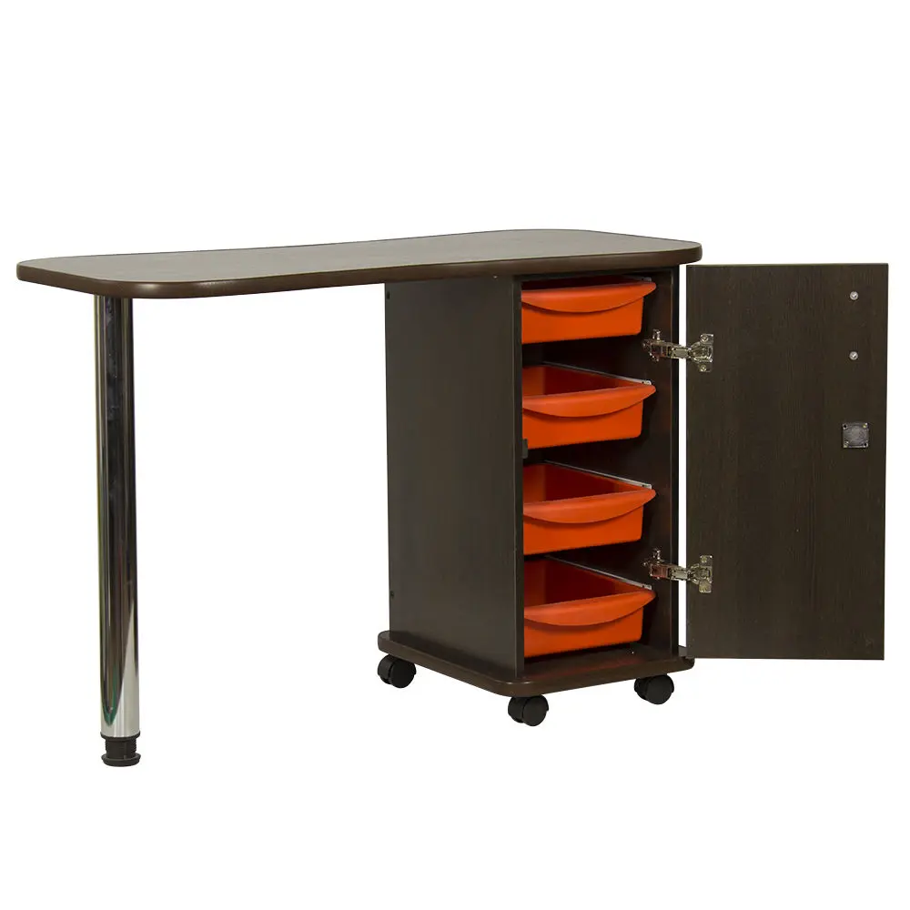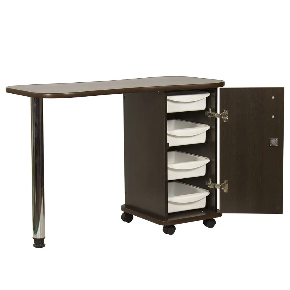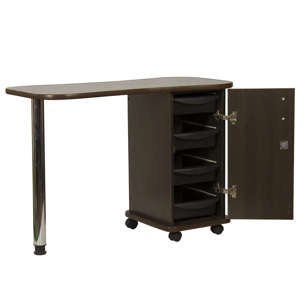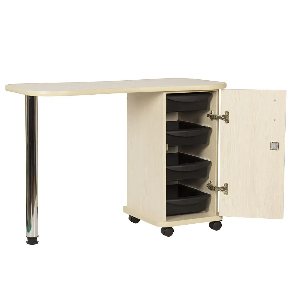 Дополнительные аппараты, оборудование и аксессуары поместятся по краям столешницы. Посредине стол имеет изогнутую форму, что делает доступ к рукам клиентов более удобным. В тумбе под столешницей есть четыре ящика, где можно систематизировать инструменты мастера. Каждый ящик легко вынимается при необходимости. В основание тумбы встроены поворотные колеса, что позволит передвинуть стол в нужную зону кабинета.