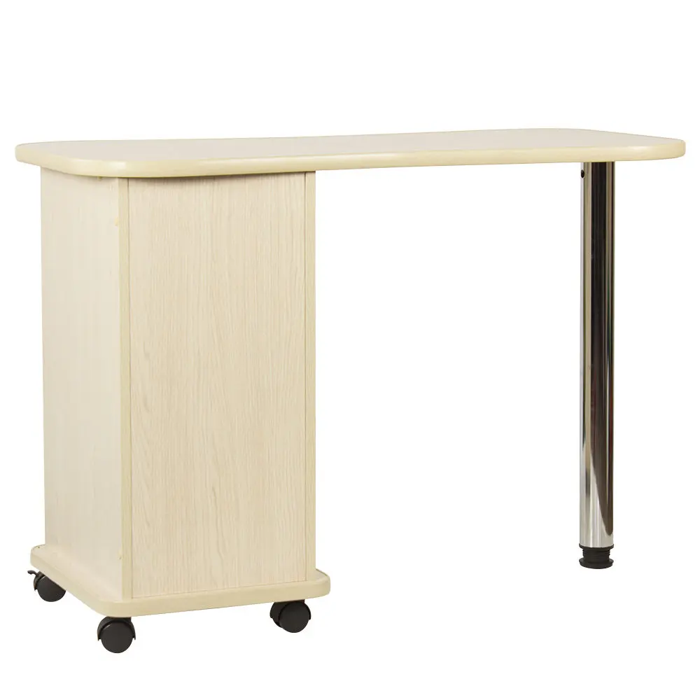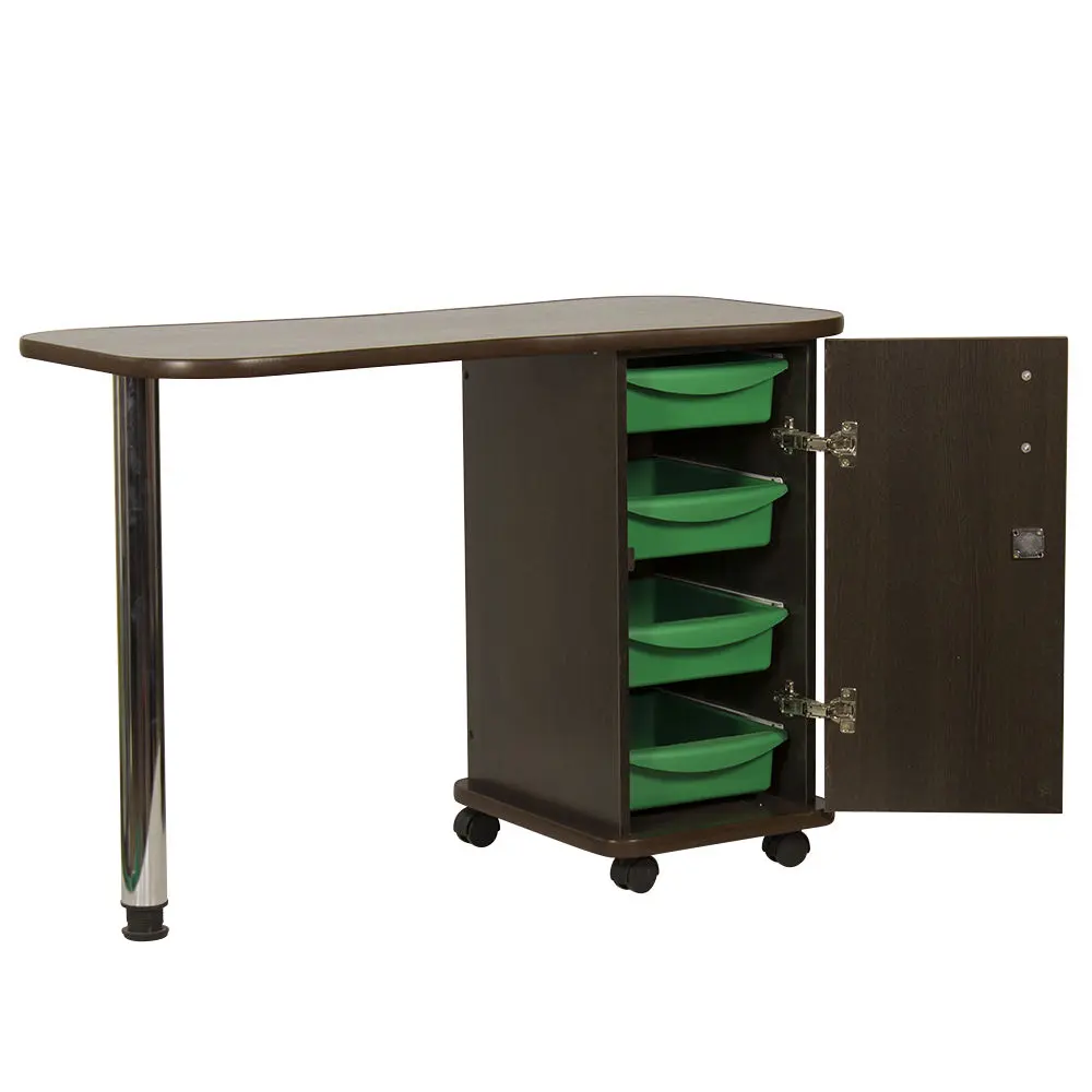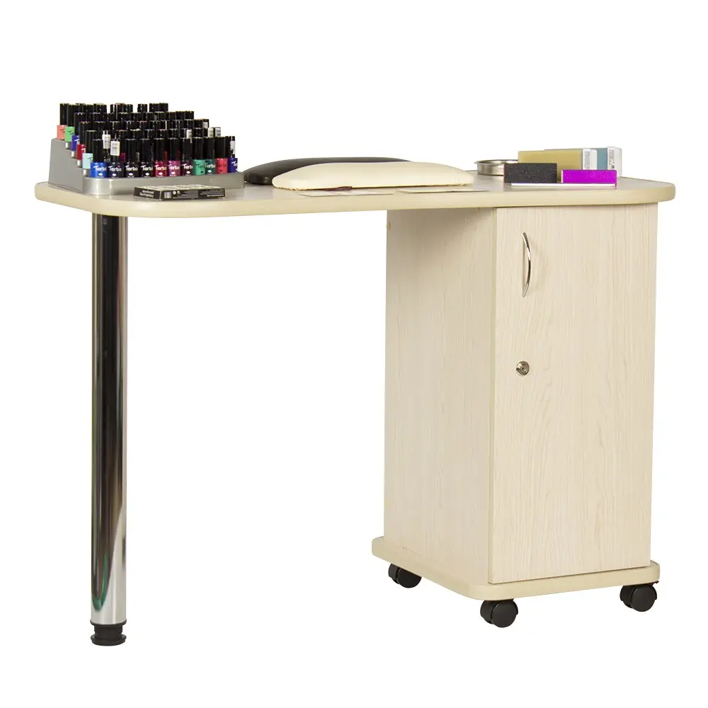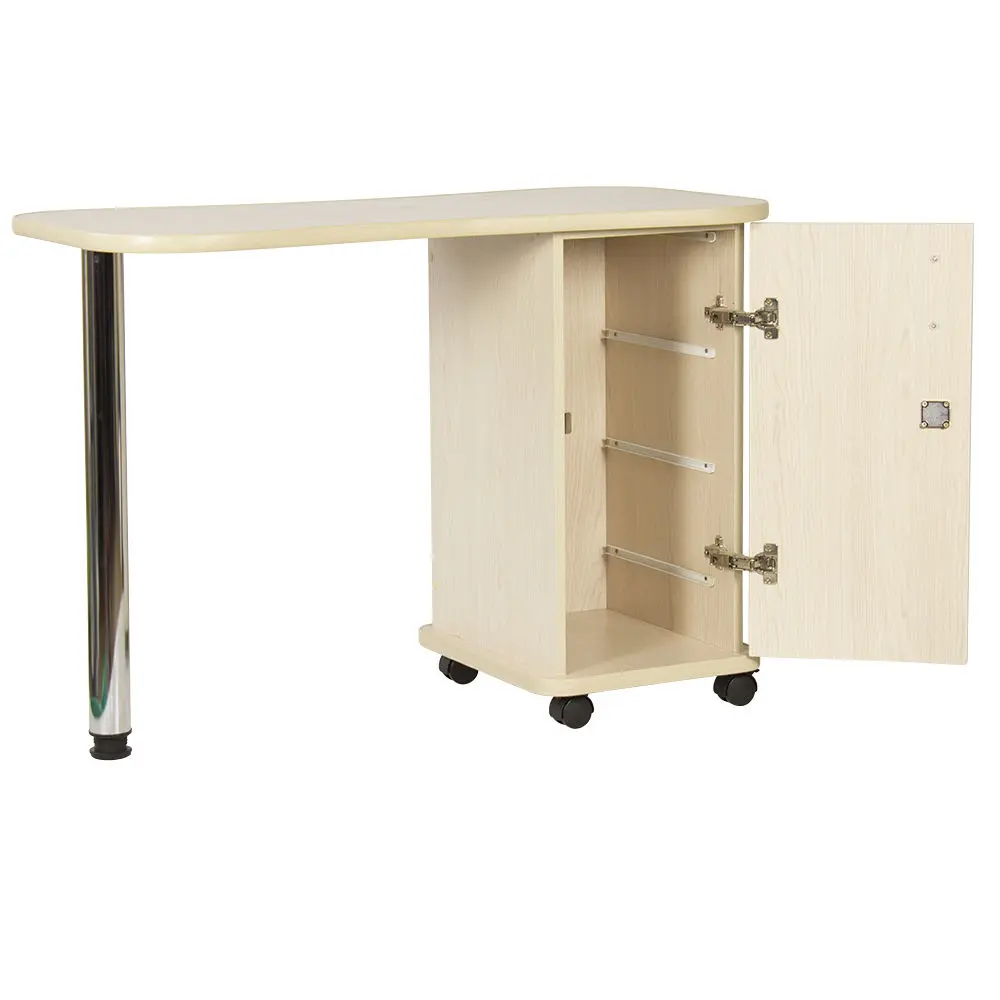 Дополнительные аппараты, оборудование и аксессуары поместятся по краям столешницы. Посредине стол имеет изогнутую форму, что делает доступ к рукам клиентов более удобным. В тумбе под столешницей есть четыре ящика, где можно систематизировать инструменты мастера. Каждый ящик легко вынимается при необходимости. В основание тумбы встроены поворотные колеса, что позволит передвинуть стол в нужную зону кабинета.
