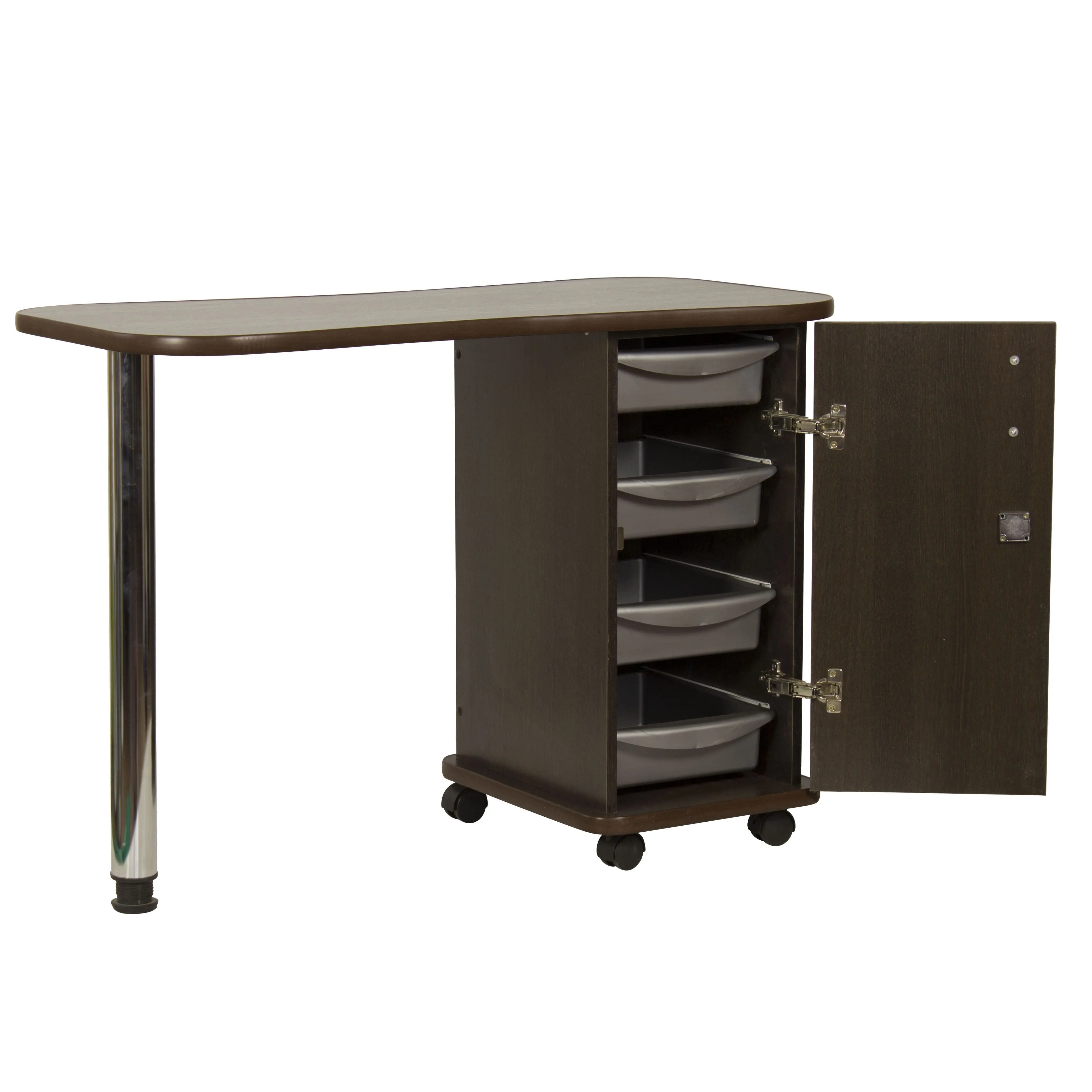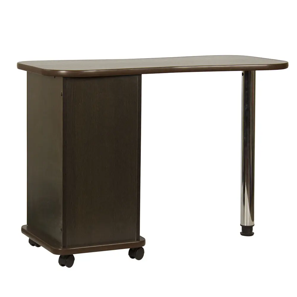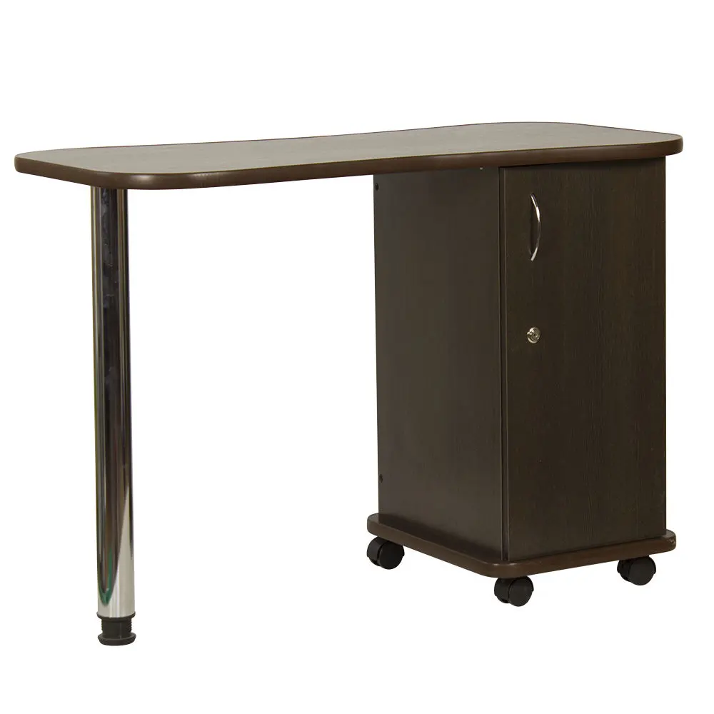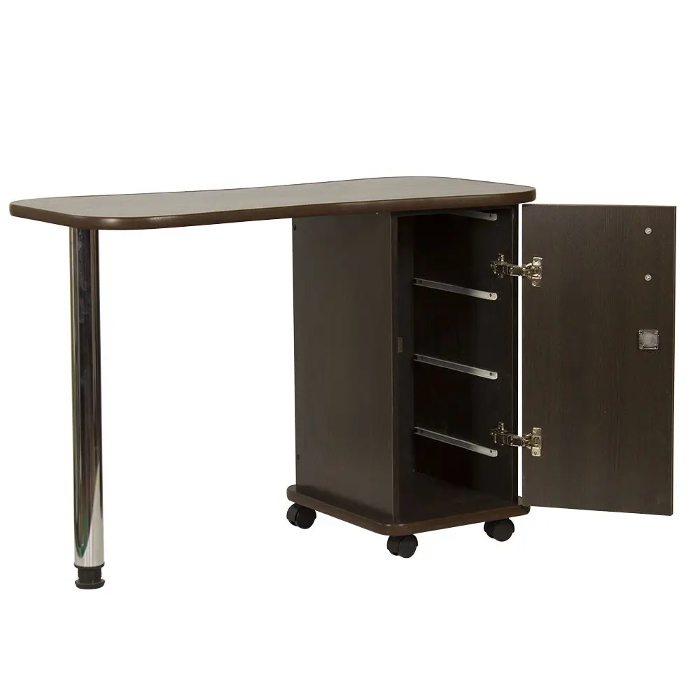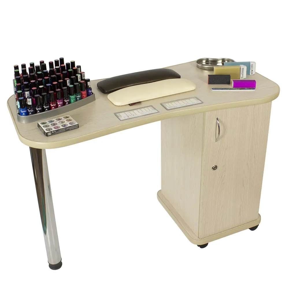 Дополнительные аппараты, оборудование и аксессуары поместятся по краям столешницы. Посредине стол имеет изогнутую форму, что делает доступ к рукам клиентов более удобным. В тумбе под столешницей есть четыре ящика, где можно систематизировать инструменты мастера. Каждый ящик легко вынимается при необходимости. В основание тумбы встроены поворотные колеса, что позволит передвинуть стол в нужную зону кабинета.