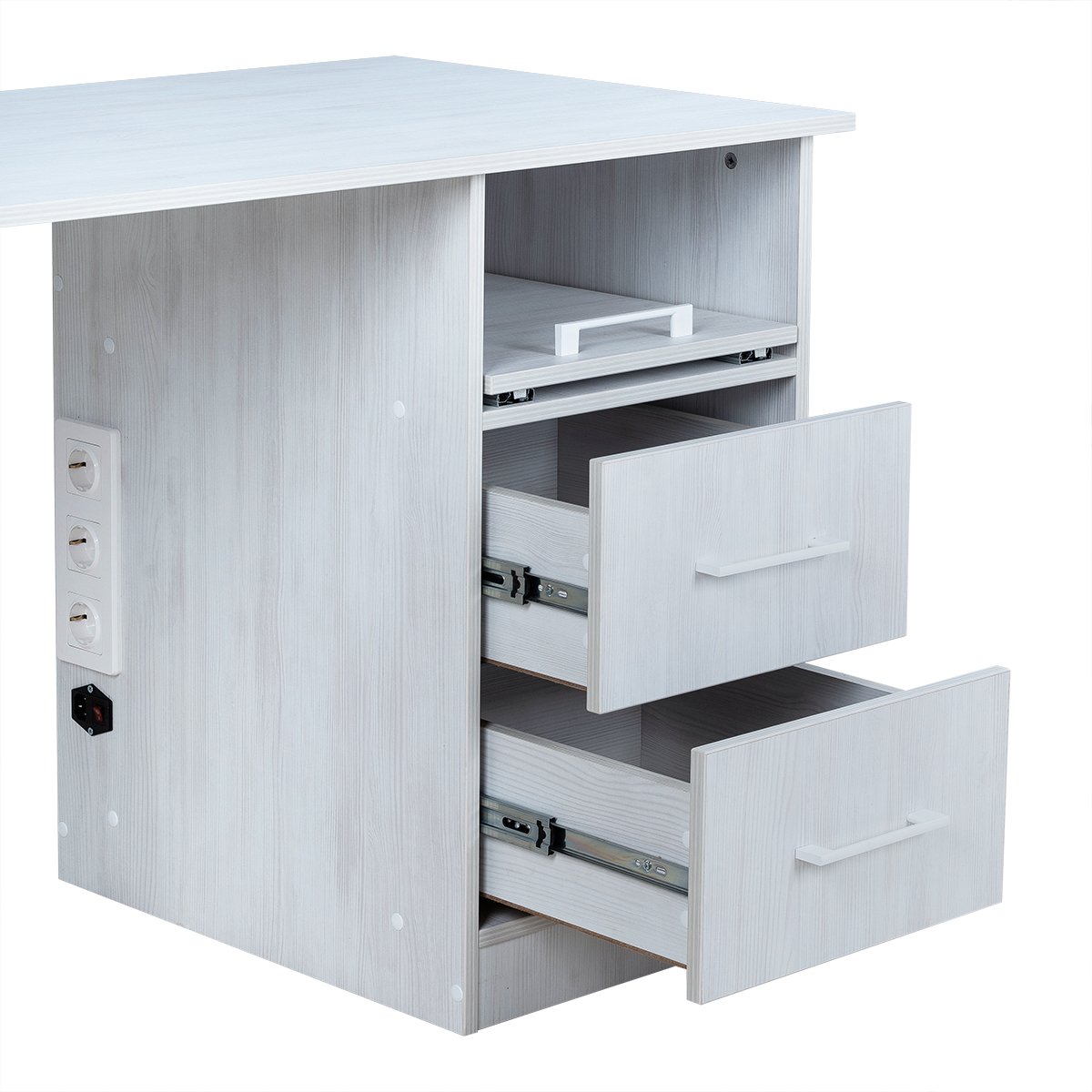 Сбоку расположен функциональный блок: два выдвижных ящика для хранения инструментов и материалов, а также открытая верхняя полочка для часто используемых предметов. Встроенные розетки делают работу мастера удобнее — всё оборудование подключается прямо на месте.