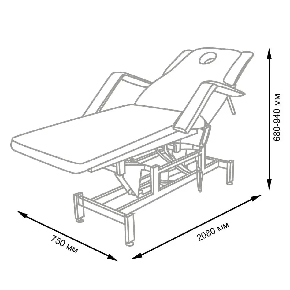Комплектация: кушетка, подлокотники, съемная подушка, металлические элементы каркаса и основания, электропривод с двумя электромоторами и дистанционным пультом управления.