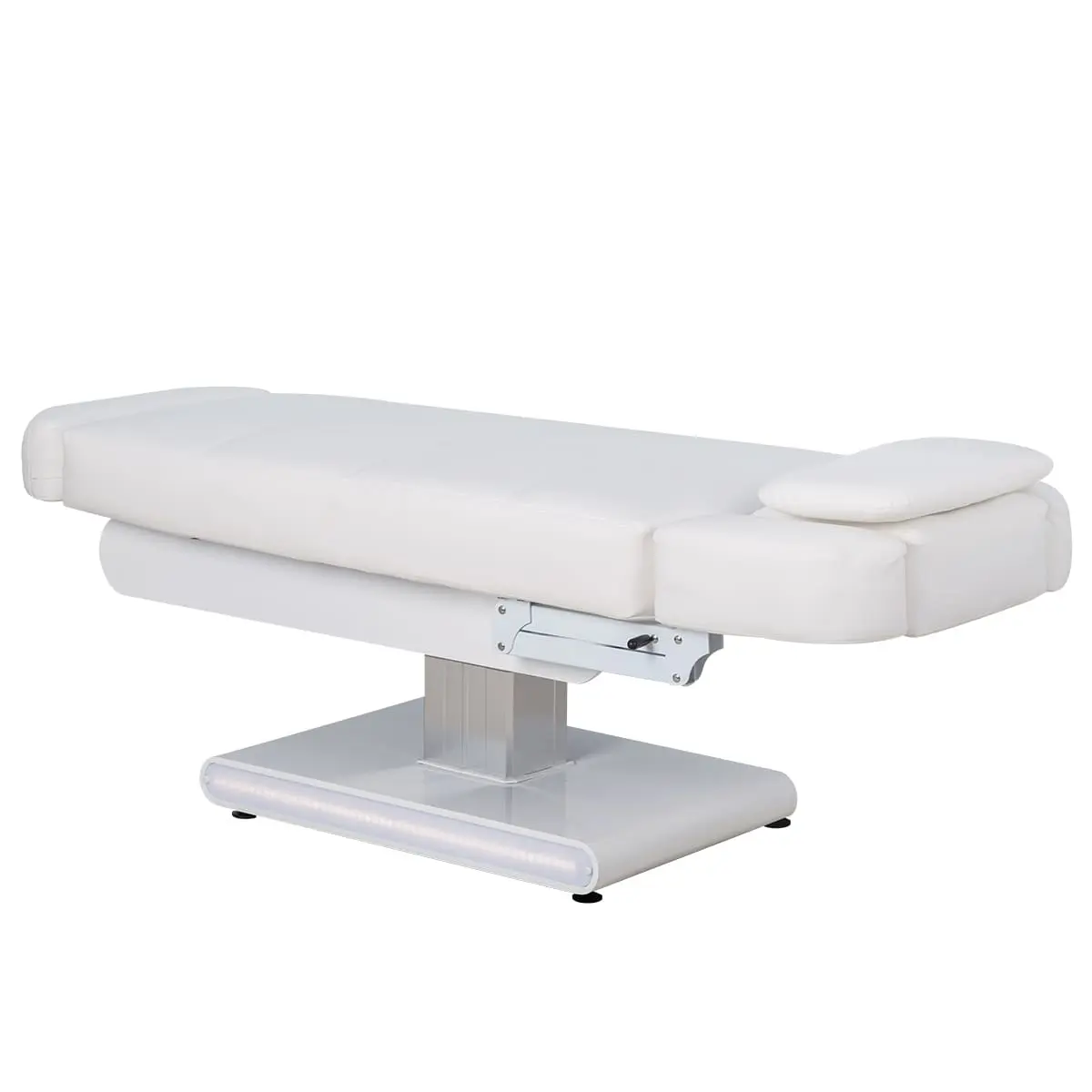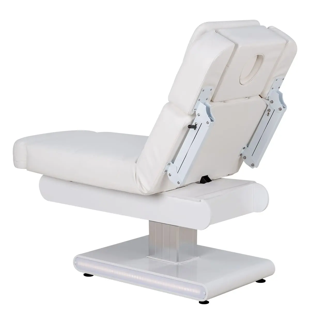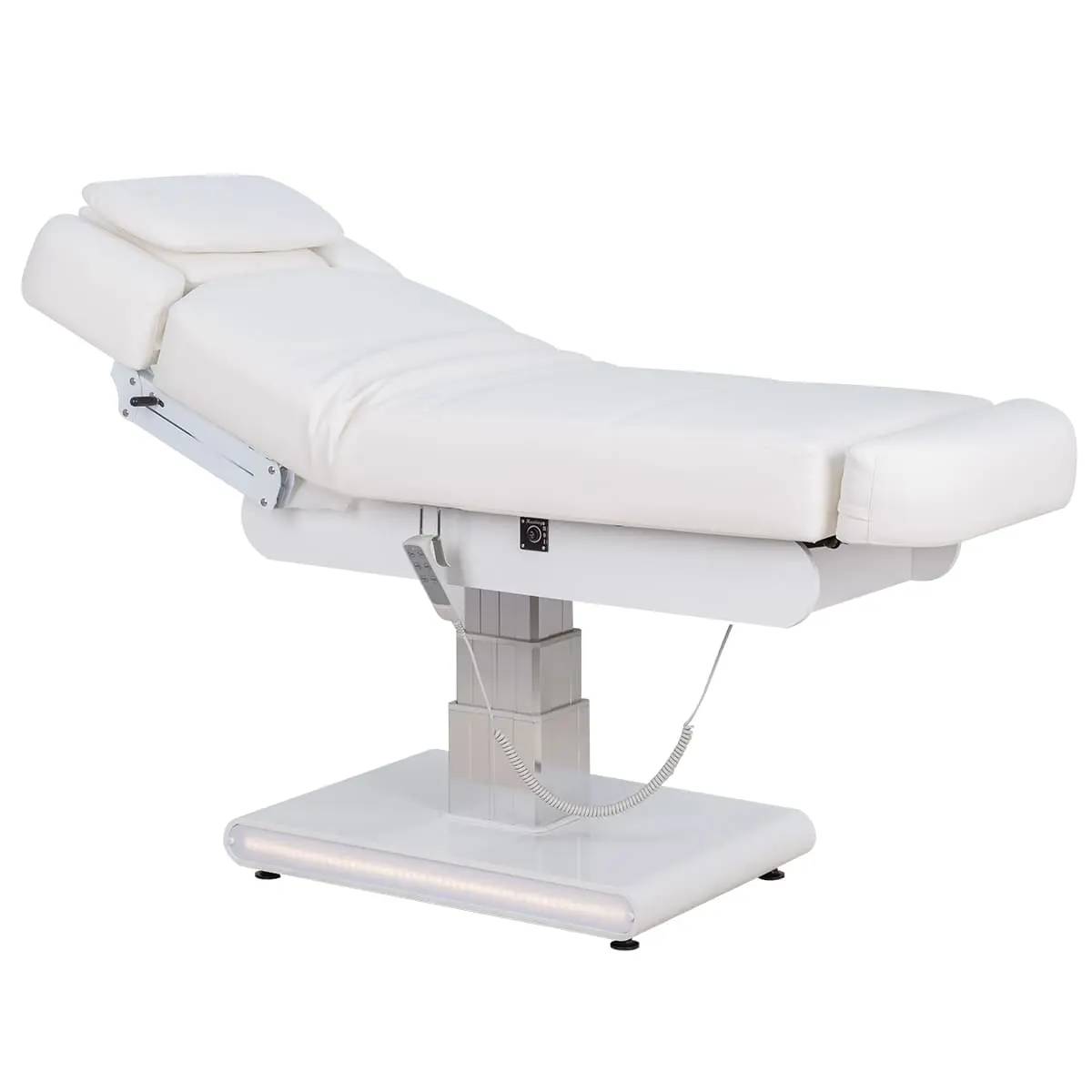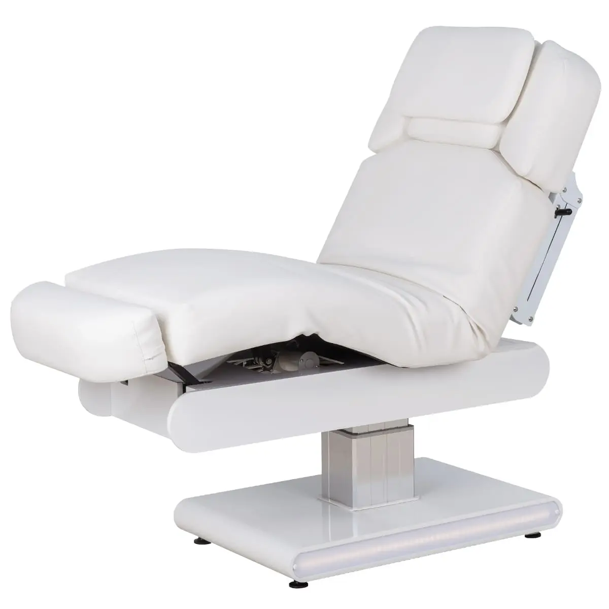 Основание кушетки на противоскользящих опорах, каркас оснащён стильной серебристой колонной, равномерно распределяющей нагрузку, что добавляет надёжности и увеличивает срок службы. Регулировка высоты и положений кресла осуществляется с помощью 3 электромоторов.