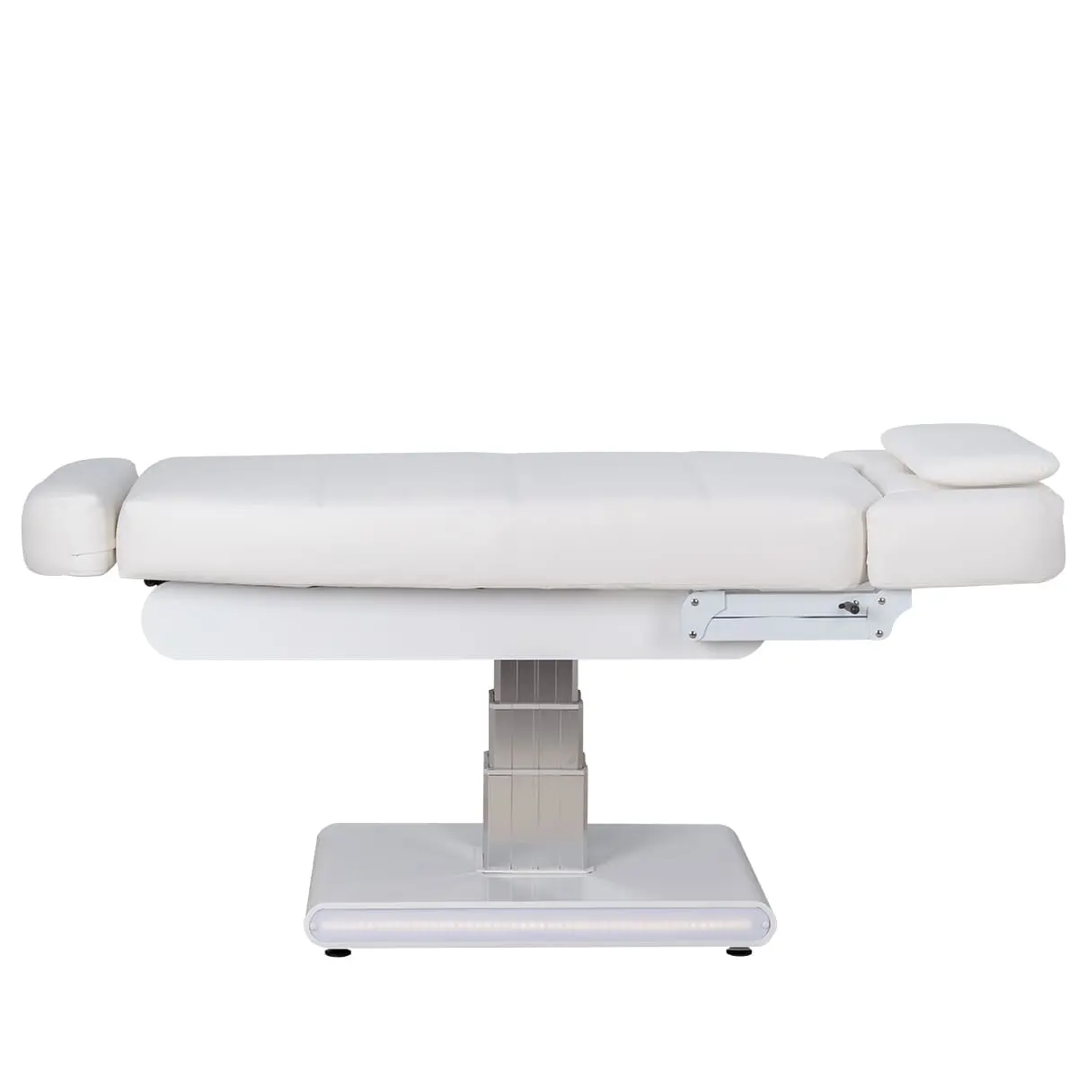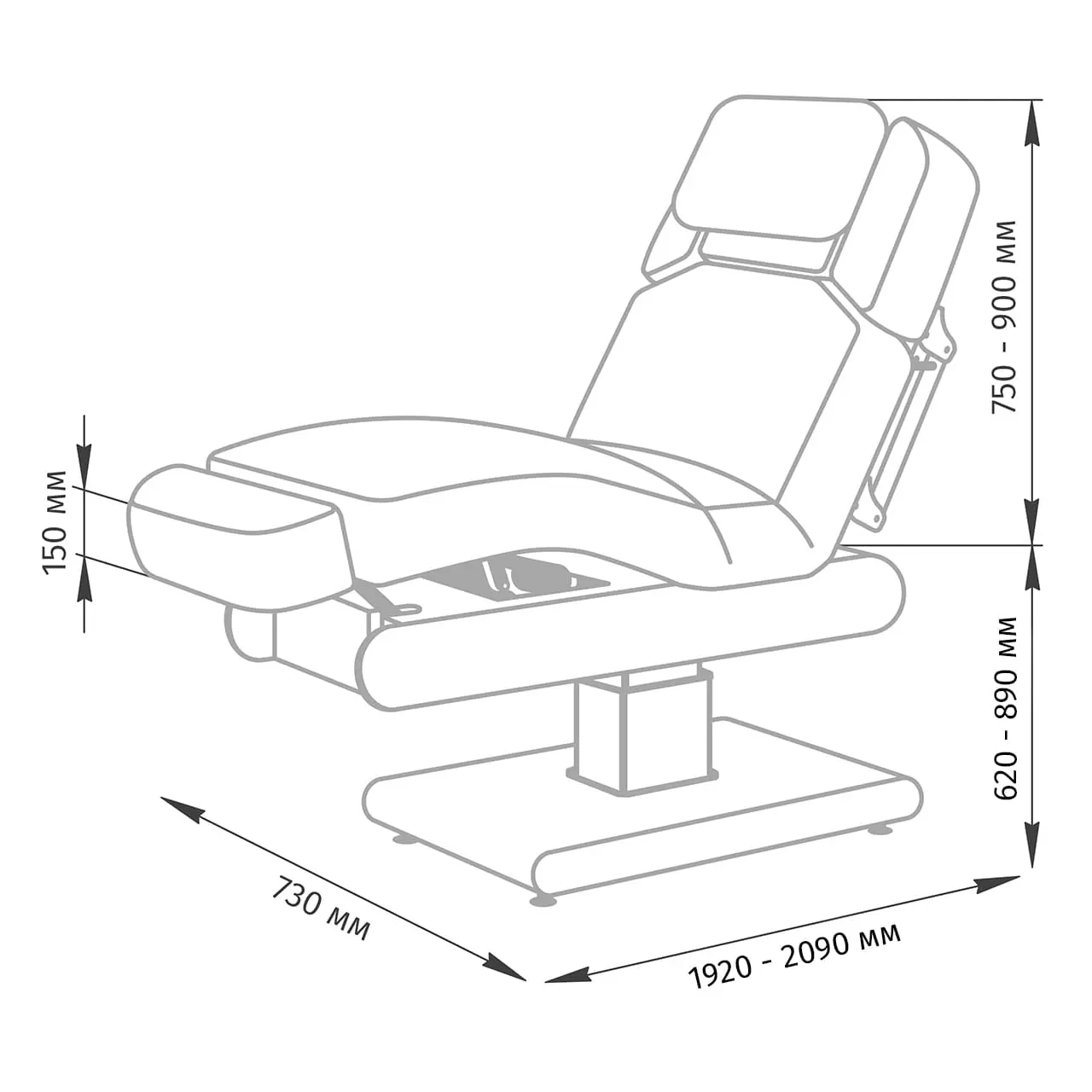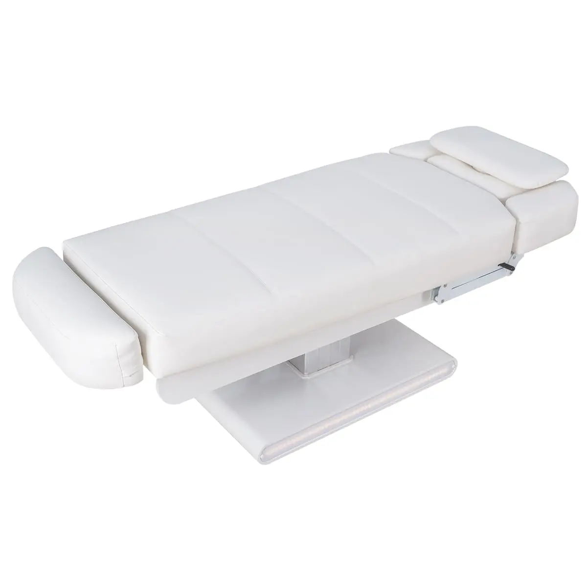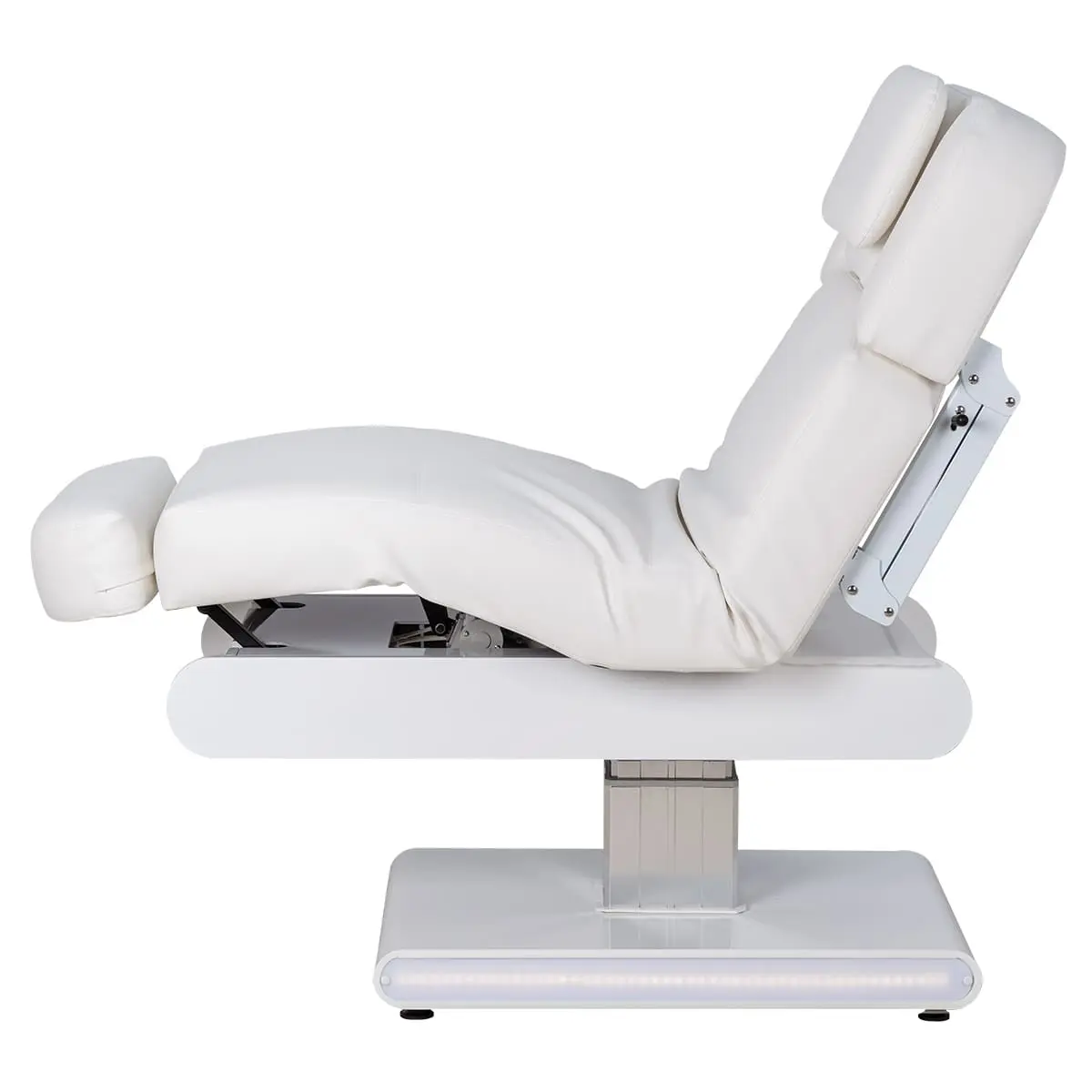 Основание кушетки на противоскользящих опорах, каркас оснащён стильной серебристой колонной, равномерно распределяющей нагрузку, что добавляет надёжности и увеличивает срок службы. Регулировка высоты и положений кресла осуществляется с помощью 3 электромоторов.