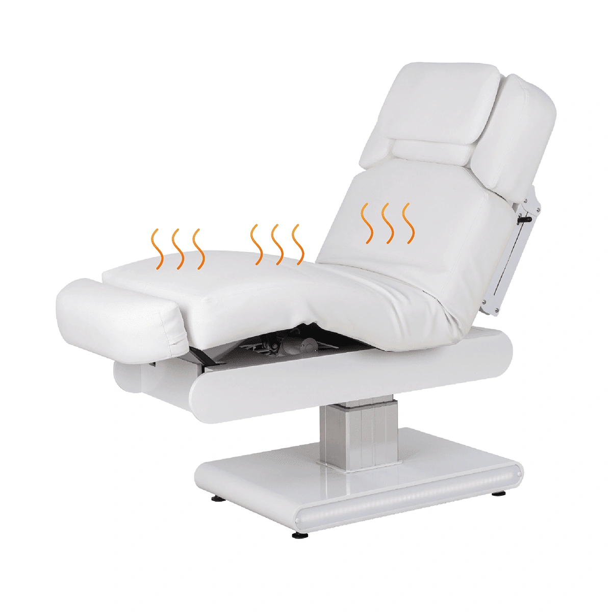 Электроподогрев ложа обеспечивает комфорт и удобство клиента во время проведения процедуры. После нажатия кнопки включения обогрева (красный индикатор/зеленый индикатор) температура начнет повышаться. Когда с комнатной температуры она достигнет максимального значения, то сработает защитный механизм, температура медленно снизится примерно до 35 градусов, а затем снова медленно нагреется до 42 градусов.