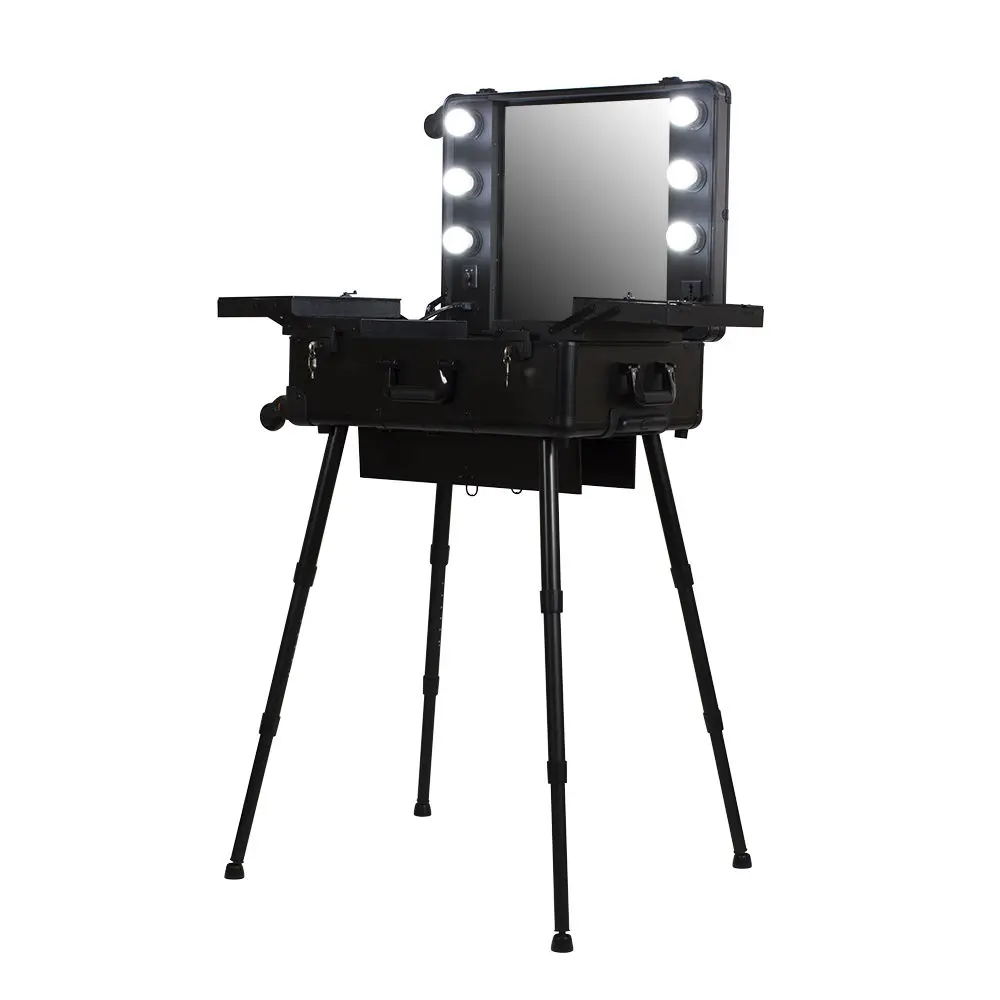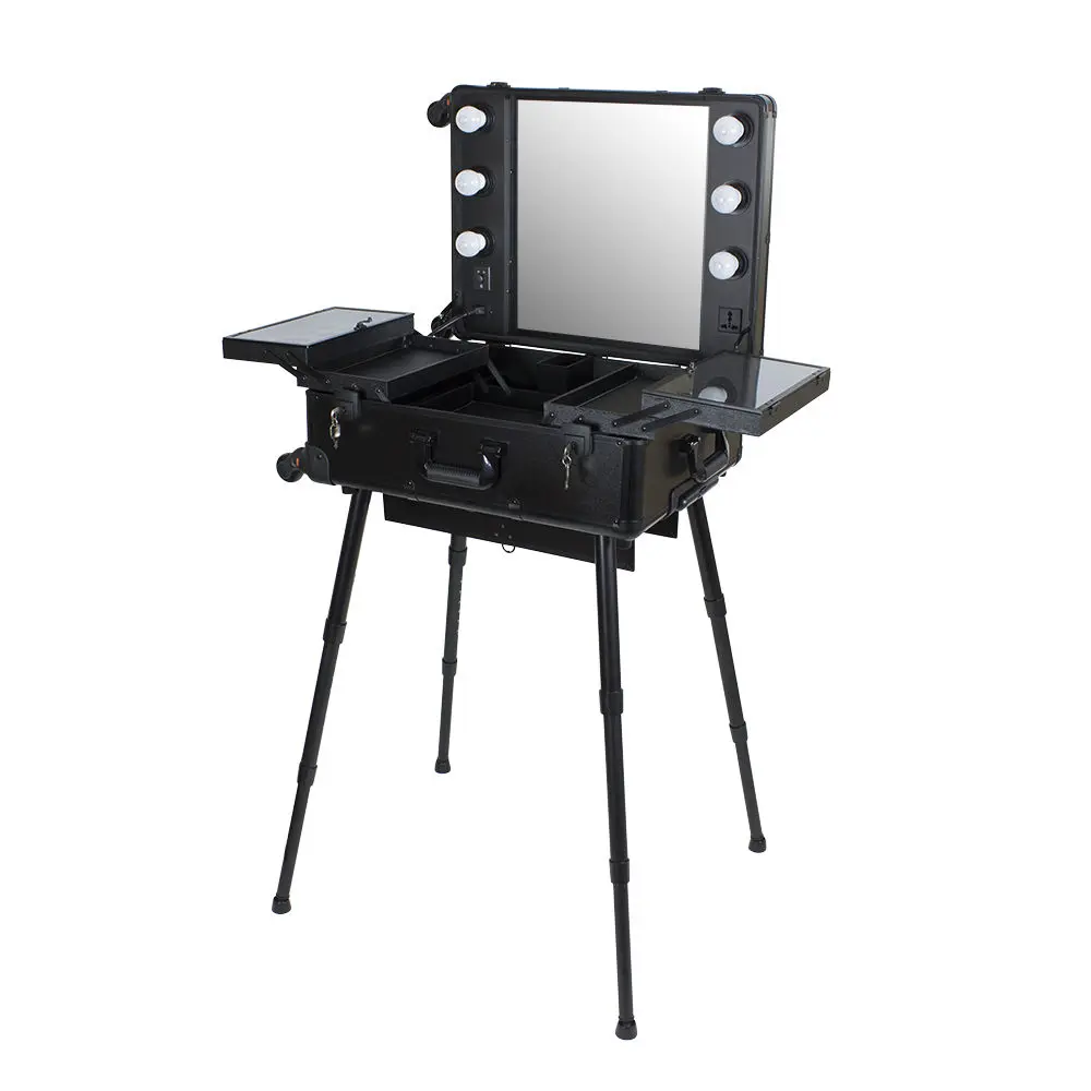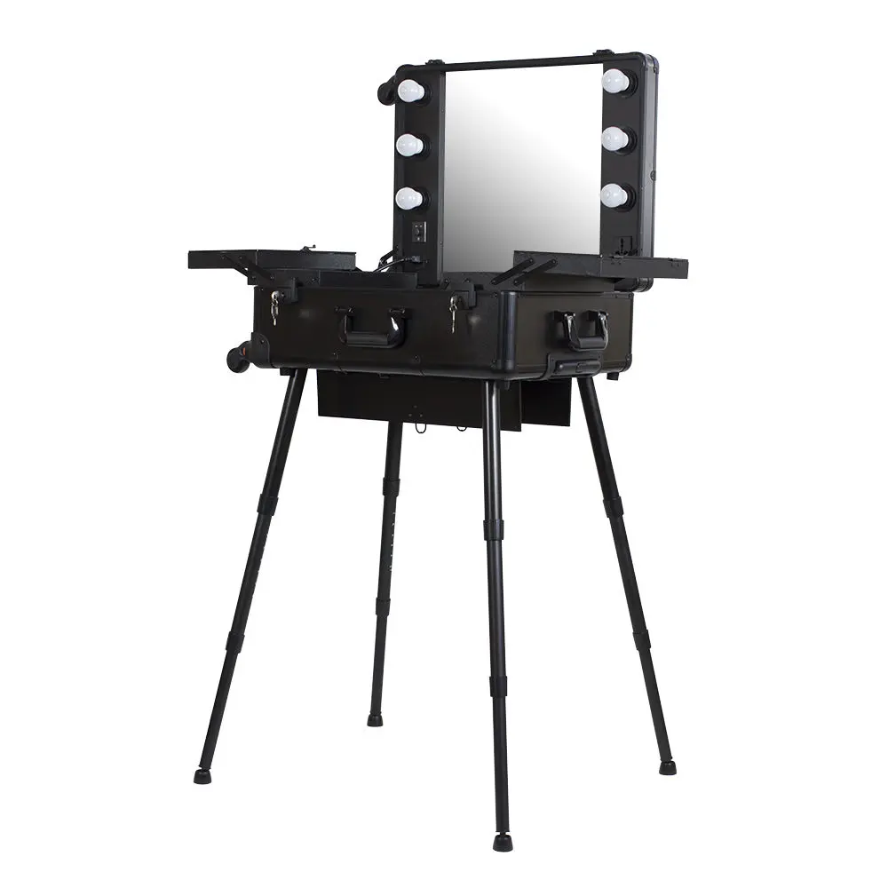 Мобильная студия визажиста VZ-210 поможет создать профессиональный уголок в любом салоне красоты или на выездном мероприятии. Студия представляет собой компактный столик с раздвижными полочками, зеркало и освещение из 6 ламп. В полочках предусмотрено специальное пространство для хранения косметики и инструмента, на верхних полках есть место для хранения палитры теней. Удобные телескопические ножки обеспечивают установку студии на любой поверхности. Высоту треноги можно регулировать.