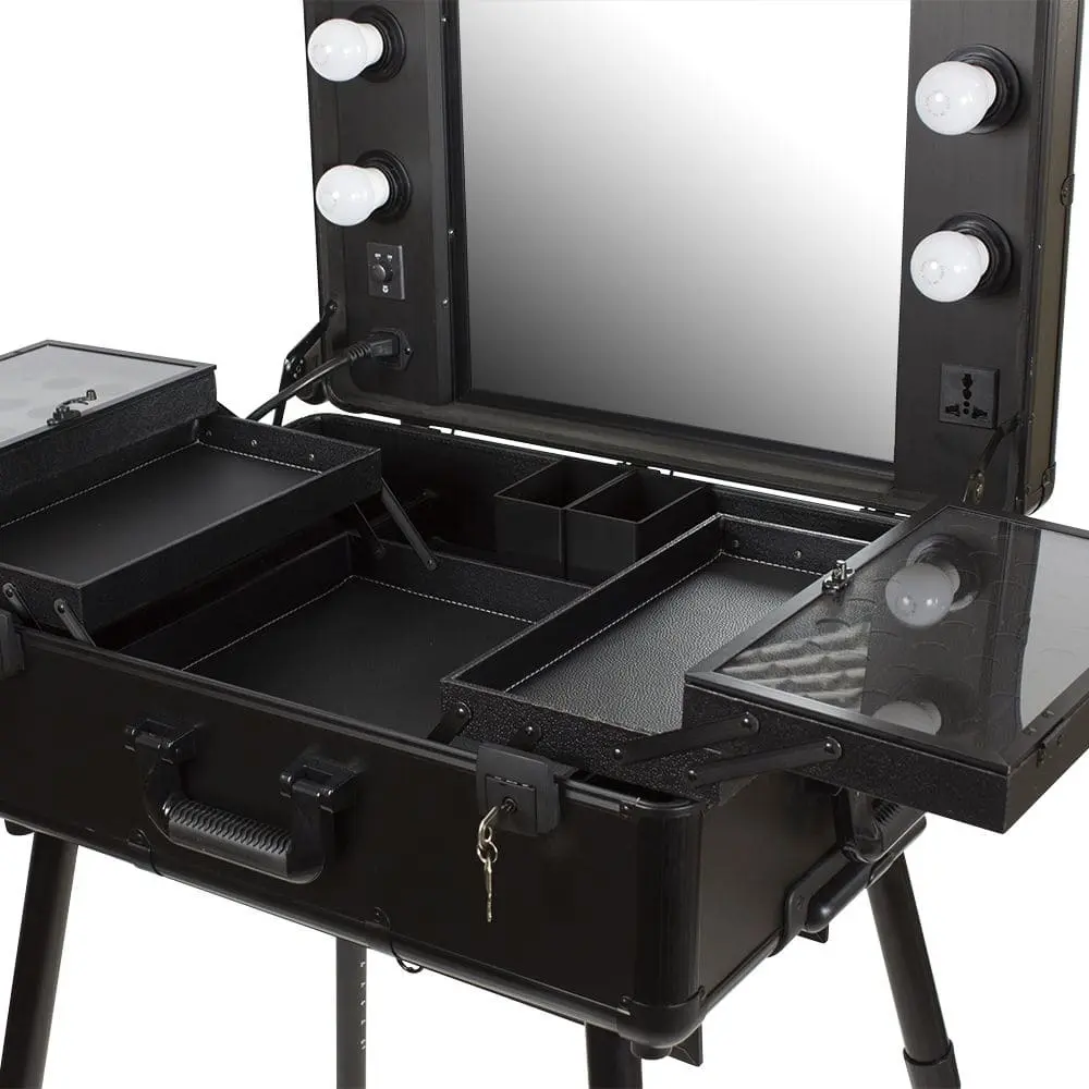 Комплектация: чемодан на колёсах с выдвижной ручкой, зеркало, 6 LED-ламп, полочки, телескопические ножки, шнур, 2 замка и ключи.