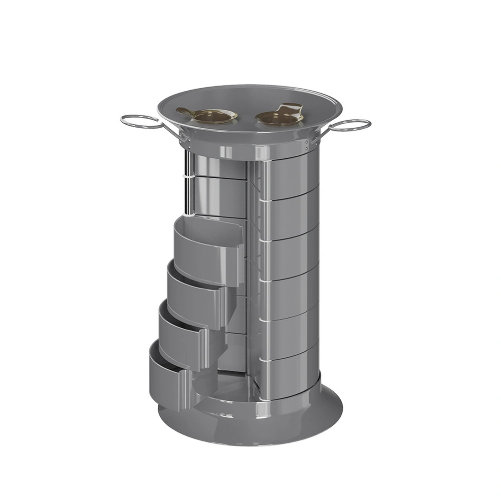 Продуманная конструкция позволит мастеру хранить все свои приспособления в одном месте. В распоряжении специалиста 16 раздвижных ящичков, которые поворачиваются вокруг стоек каркаса. Чтобы в тумбе можно было поставить высокие сосуды, с одной стороны отсутствует два ящика. Верхняя полка имеет специальные отверстия, предназначенные для емкостей и чаш. С двух сторон крышка оборудована держателями для фенов. Мобильность мебели обеспечивается шестью поворотными колесиками. Тележка может быть использована для обстановки двух рабочих мест.