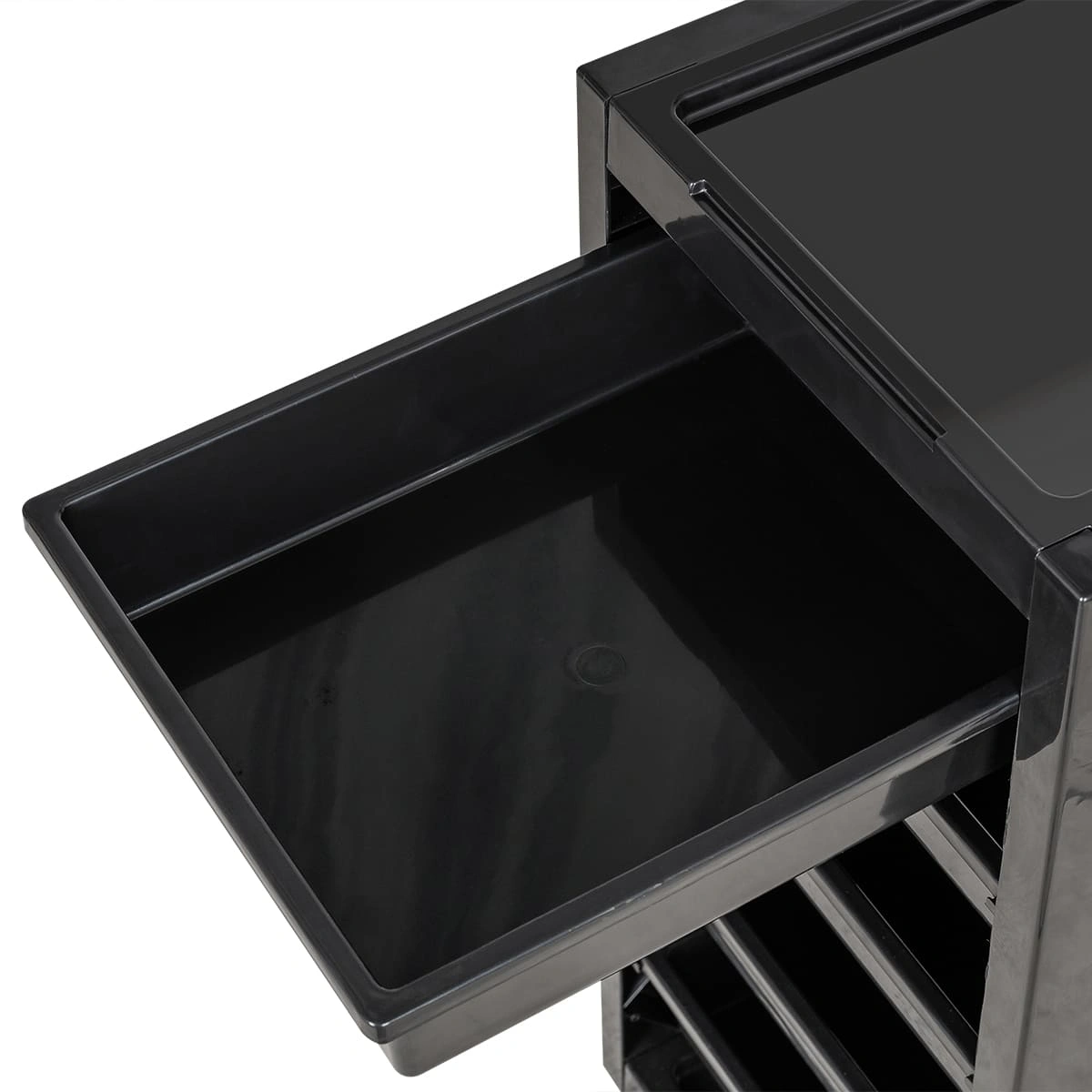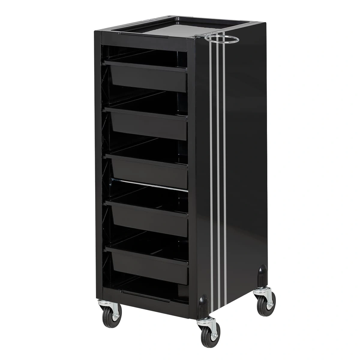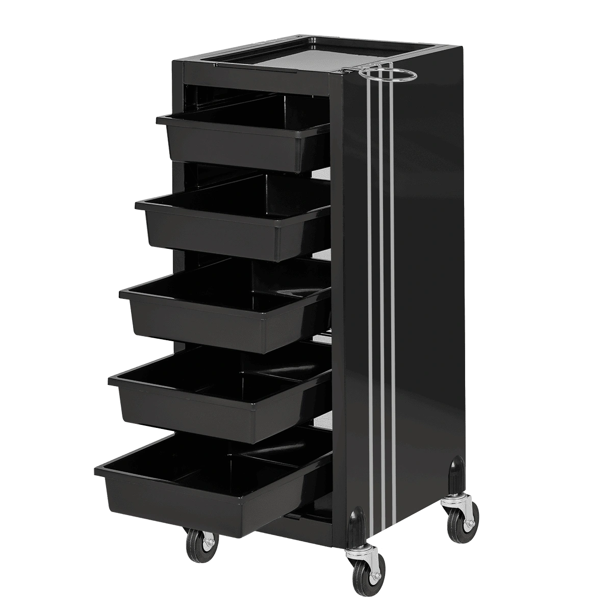 У парикмахерской тележки стильный прямоугольный дизайн с острыми углами. Верхняя крышка с фенодержателем и углублением для инструментов и баночек красоты, 5 вместительных выдвижных ящиков, это позволит мастеру организовать рабочее пространство и повысить эффективность работы.