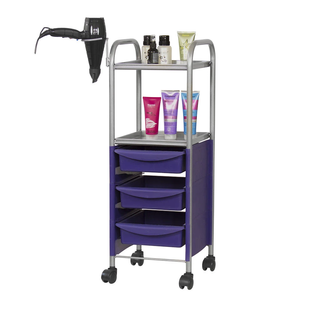Наличие бортиков убережет инструмент от случайного падения. Практичное дополнение парикмахерской тележки – удобный держатель для фена. Оборудование можно переместить в любую точку салона благодаря манёвренным колесикам.