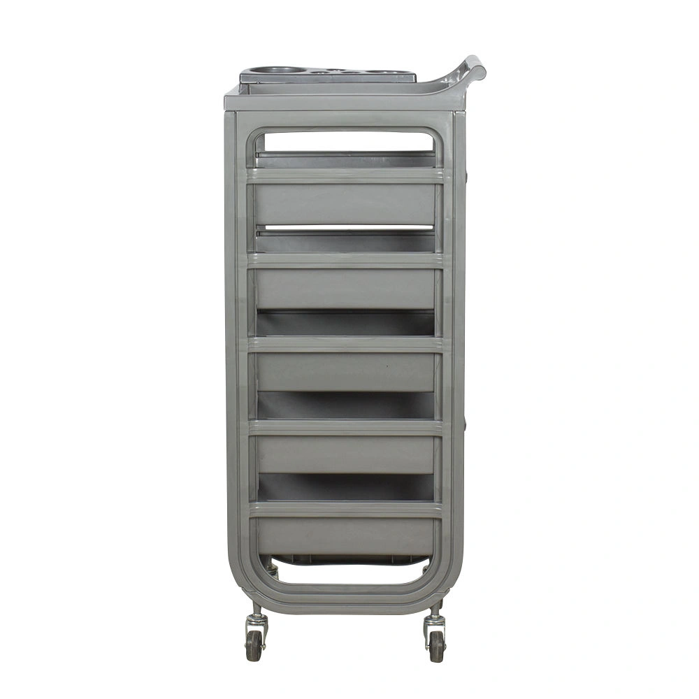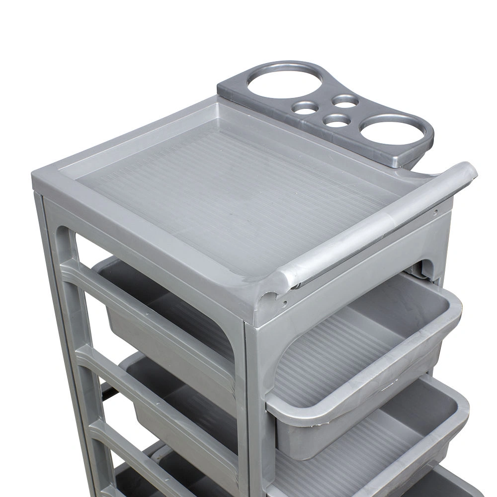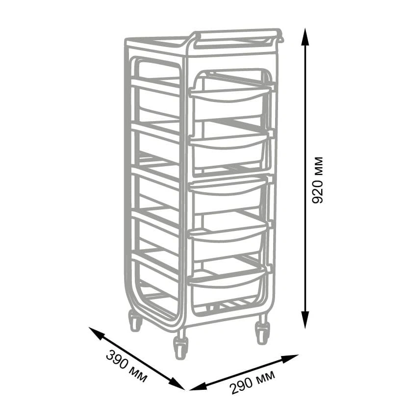 Комплектация: каркас на маневренных колесиках, пять ящиков, верхняя крышка с ручкой для перемещения парикмахерской тележки, боковая полочка с отверстиями для фена, чаши и брашингов. Предусмотрен держатель для фена с отверстиями разного диаметра.