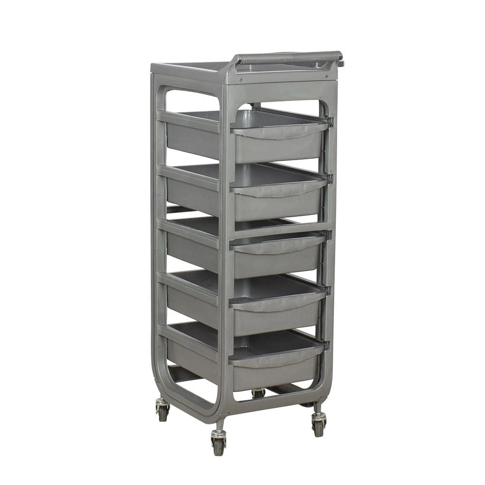 Стильная и удобная тележка парикмахерская Т-15 отличается хорошей вместительностью и функциональностью. В ней мастер сможет хранить все необходимые рабочие принадлежности и аксессуары. Парикмахерская тележка комплектуется пятью выдвижными ящичками, верхней крышкой в виде полки и боковым держателем для брашингов, фена и чаши. Ящики расположены на оптимальной высоте друг от друга для удобного расположения различных инструментов, приборов и расходных материалов. Дно ящиков и верхней полки имеет антискользящую поверхность.