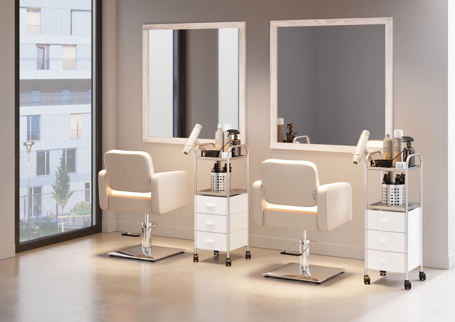Большое зеркало в широкой раме визуально расширяет пространство и позволяет мастеру контролировать процесс работы под любым углом.
