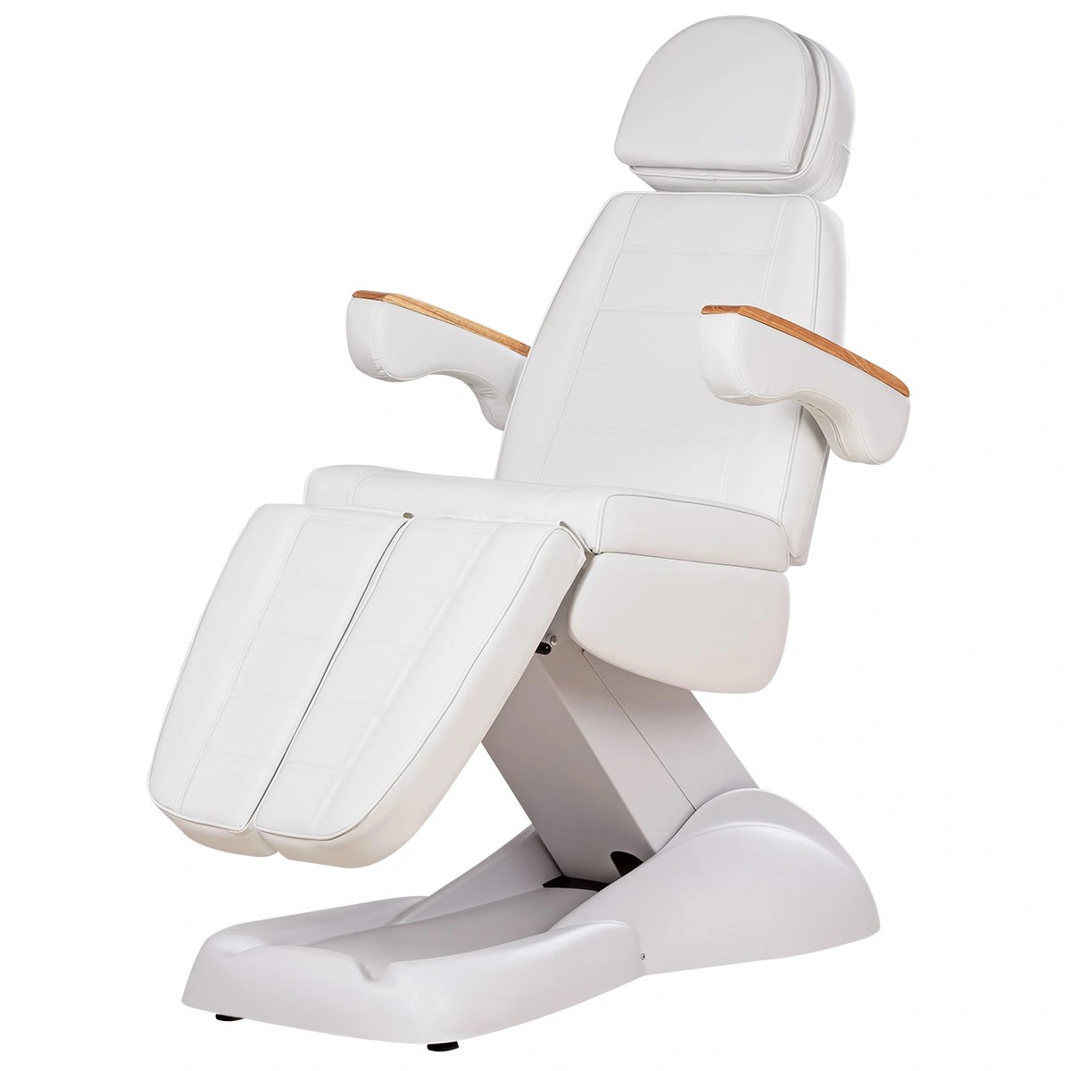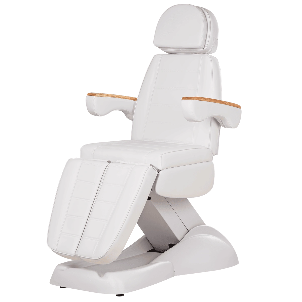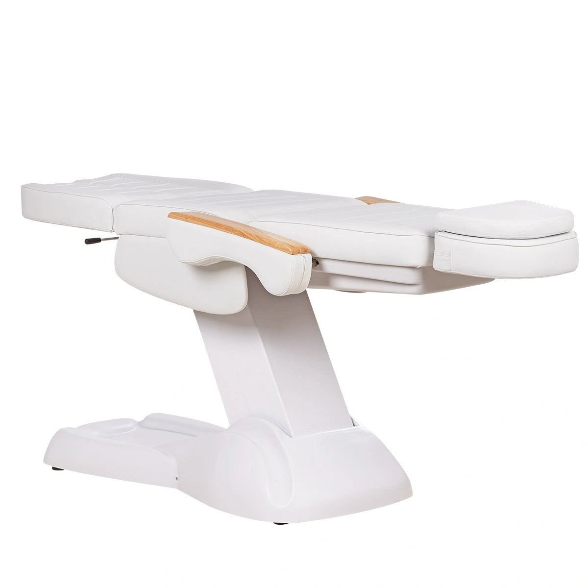 Кресло имеет устойчивое широкое основание, конструкция полностью раскладывается в горизонтальное положение, имеются выдвижной подголовник с отверстием для лица, которое при необходимости можно закрыть мягкой подушкой и съёмные подлокотники со стильными деревянными вставками. Модель можно использовать для различных процедур: педикюр, наращивание ресниц, косметология, оформление бровей и т.д.