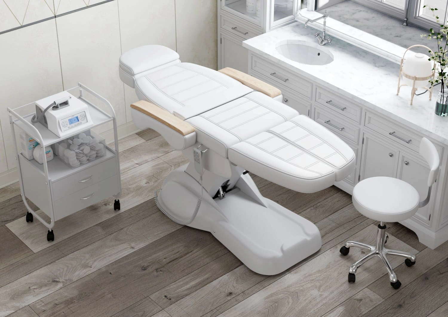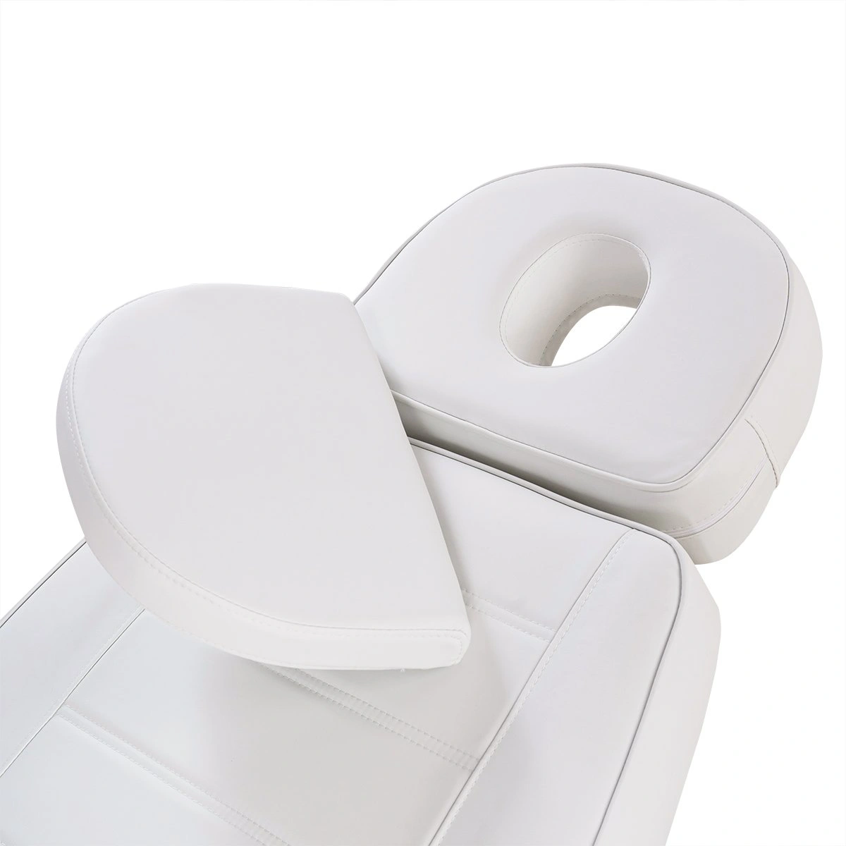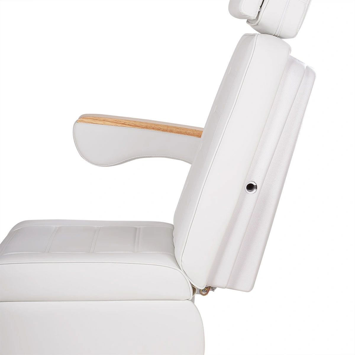 Кресло имеет устойчивое широкое основание, конструкция полностью раскладывается в горизонтальное положение, имеются выдвижной подголовник с отверстием для лица, которое при необходимости можно закрыть мягкой подушкой и съёмные подлокотники со стильными деревянными вставками. Модель можно использовать для различных процедур: педикюр, наращивание ресниц, косметология, оформление бровей и т.д.