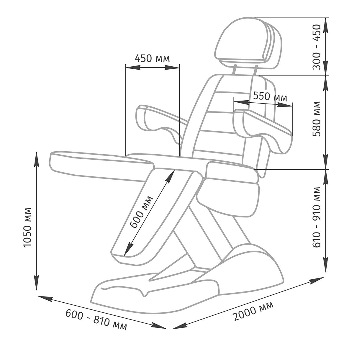 Длина и ширина подлокотников: 550 и 80 мм;
