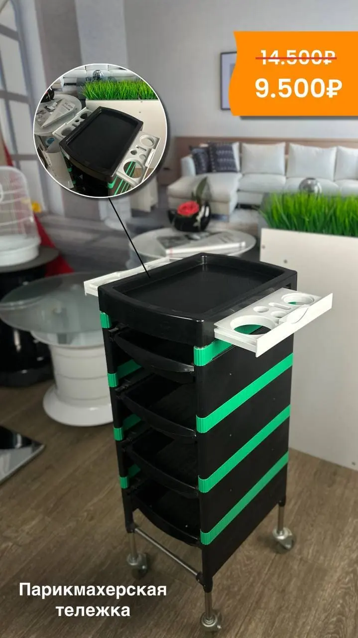 Чёрно-зелёная парикмахерская тележка с прорезиненными колёсами