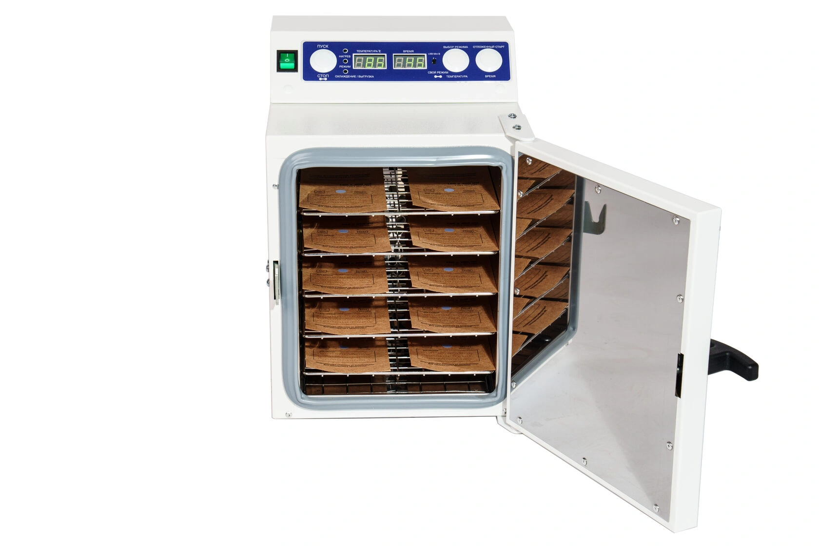 Стерилизатор "Ферропласт" при загруженной стерилизационной камере должен обеспечивать автоматическую поддержку температурных режимов в диапазоне от +85°С до +180°С и времени стерилизационной и дезинфекционной выдержки, а также пользовательского программируемого режима +50°С до +200°С, интервалом от 1 до 999 минут.